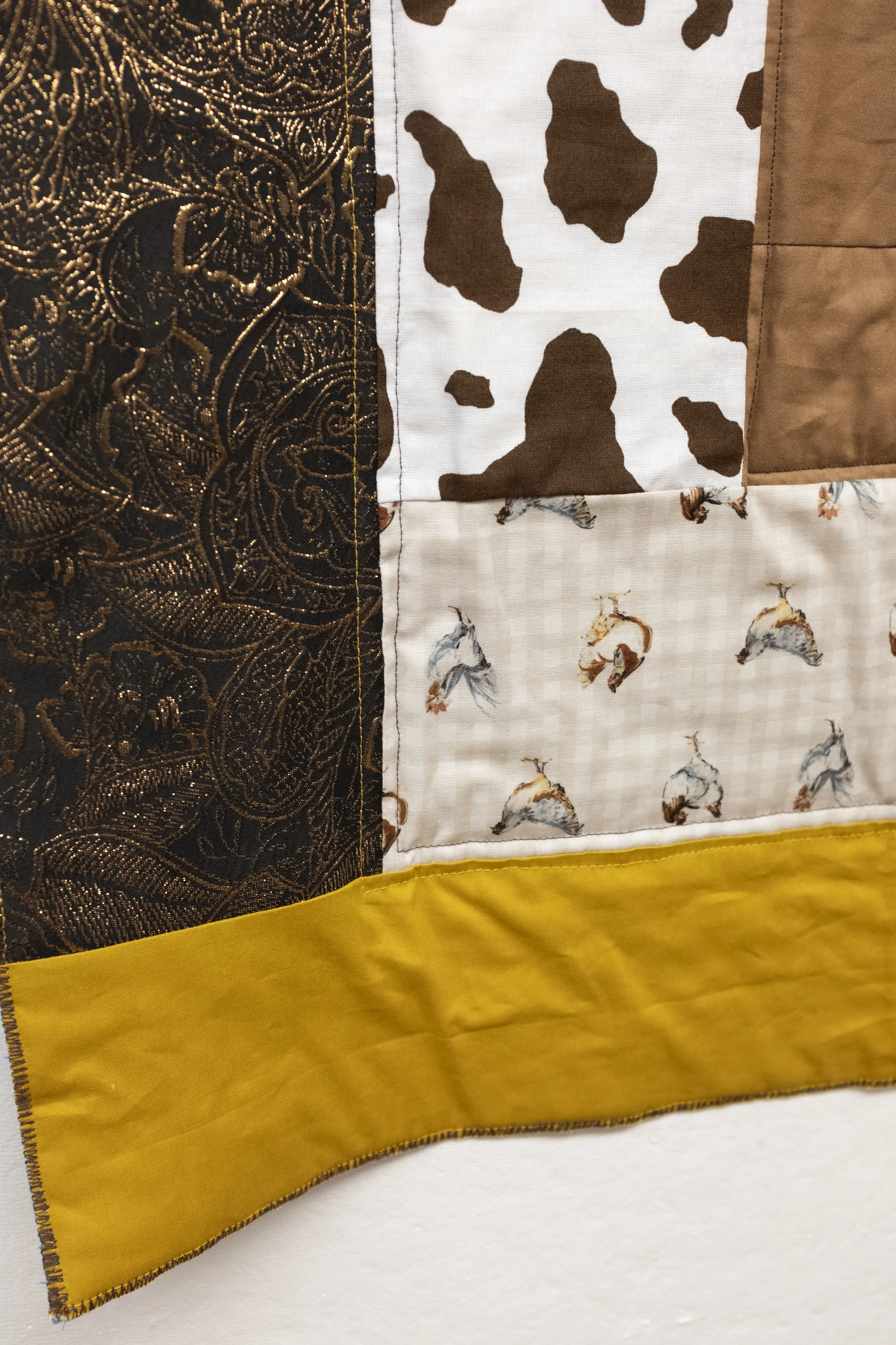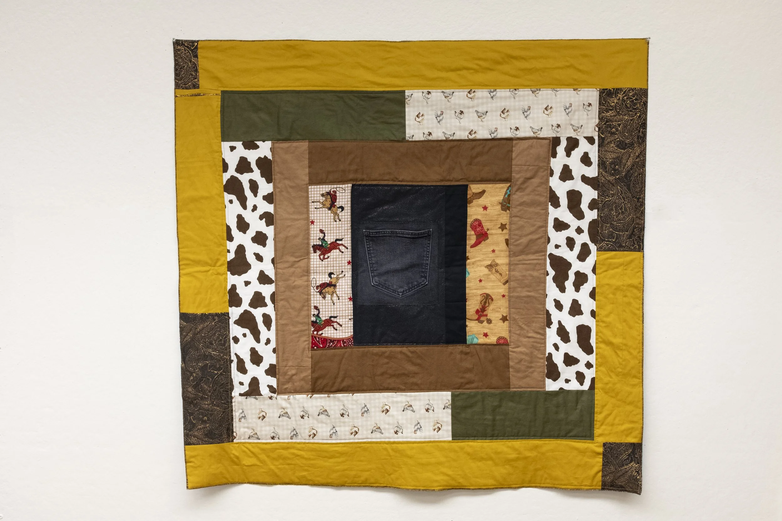 Southern Mother Clucker, 2026. Quilting cotton, dress scraps, denim jeans.