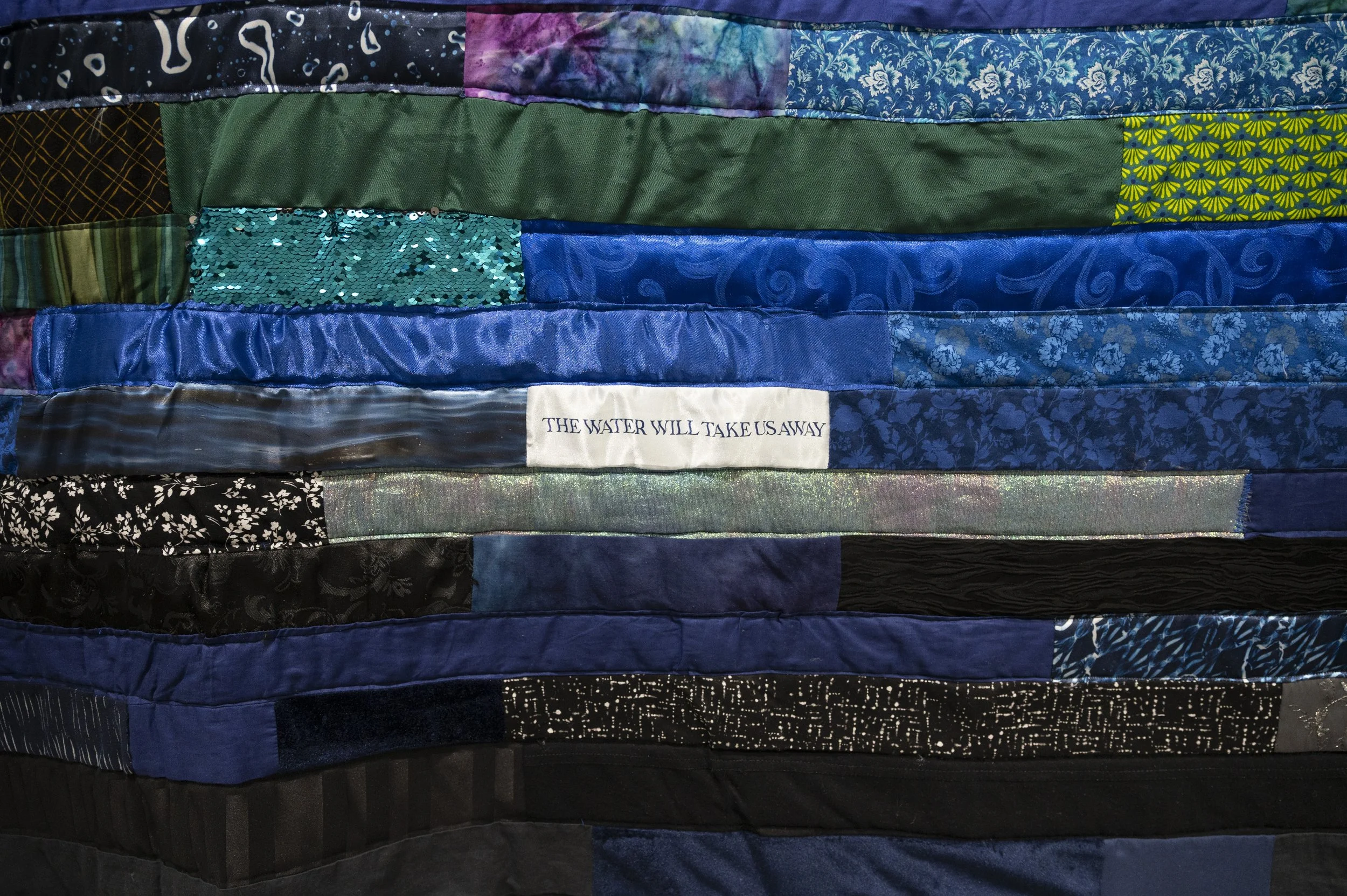 Channels, 2026. Quilt, satin, nylon, velvet, quilting cotton, silk, denim, photographs printed on satin, silk, and cotton, clothing scraps, 13’ x 4.75’