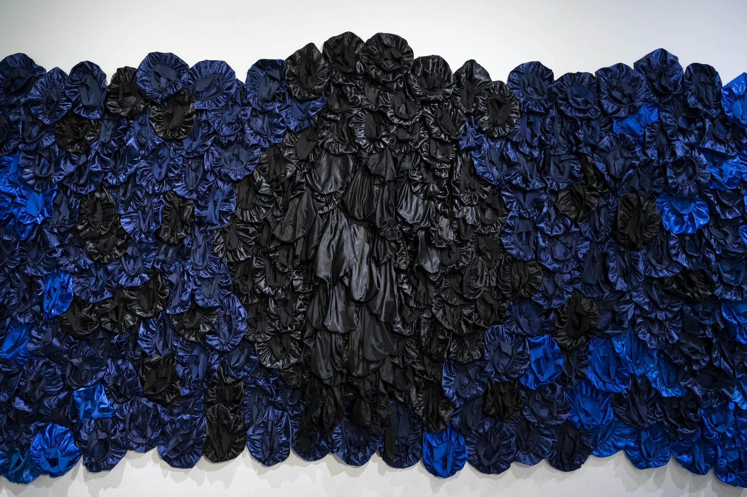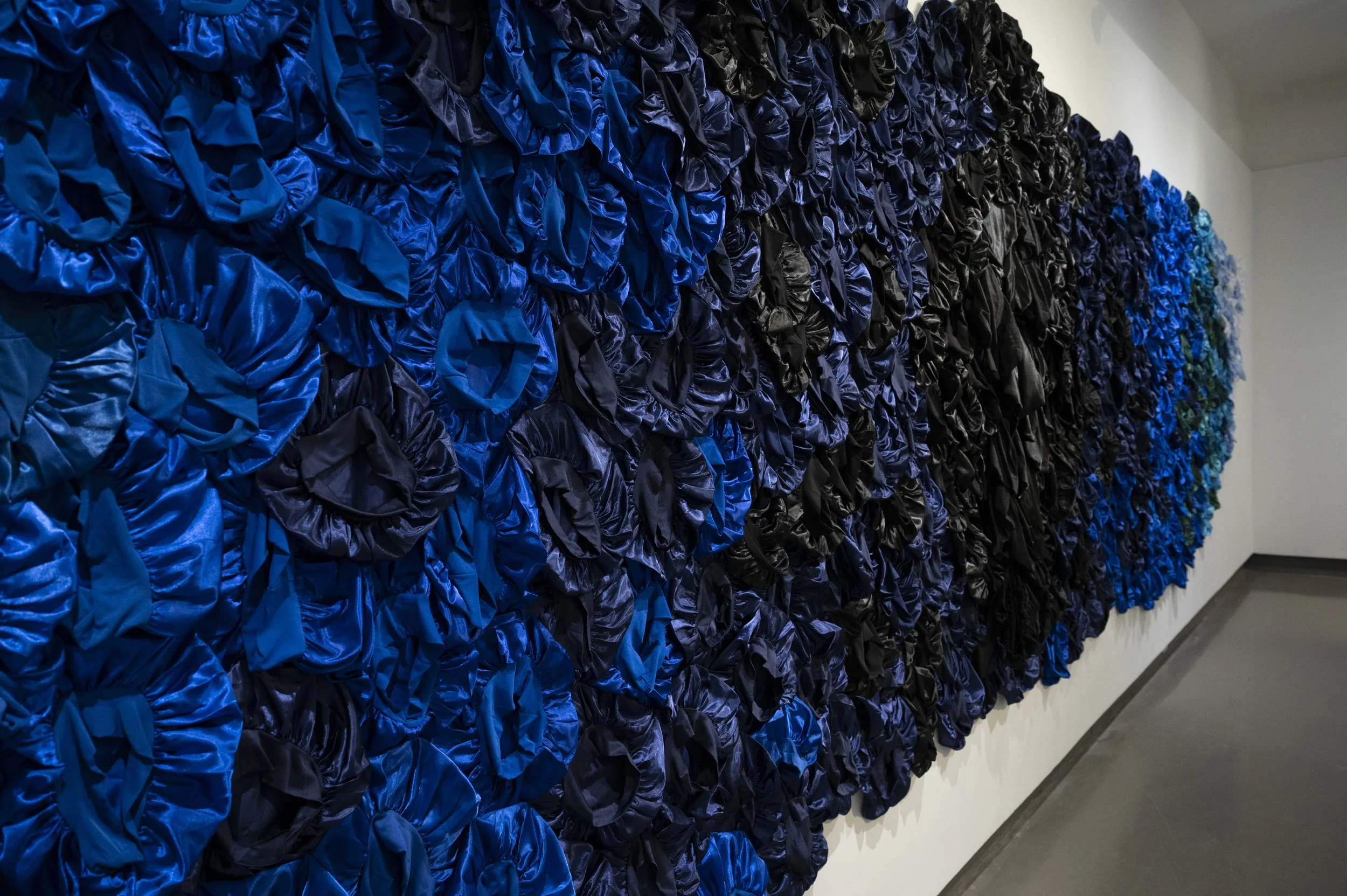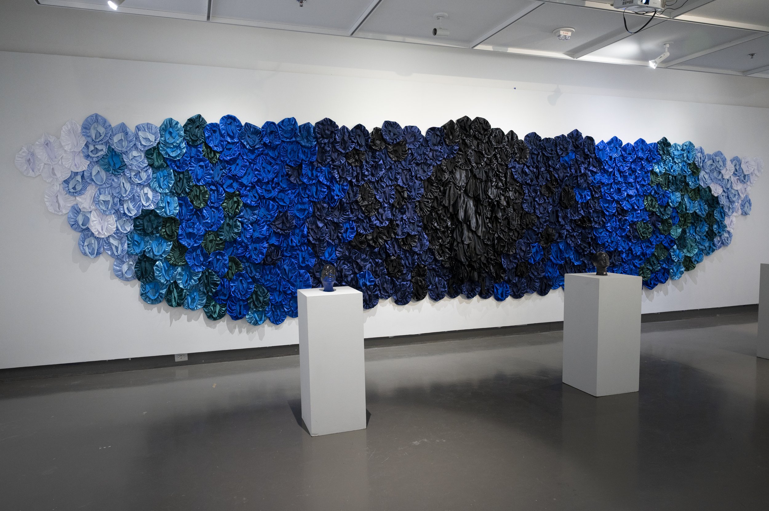 Blue Magic, 2026. Installation with satin hair bonnets, slip cast ceramic wig heads, underglaze, glaze