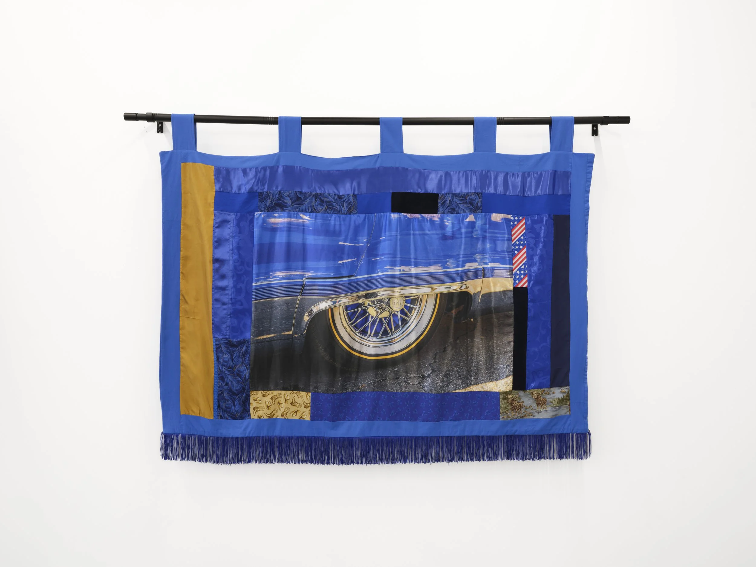 Red, White, and Blue (from Mama’s Americana), 2026. Silk, satin, quilting cotton, denim, velvet, clothing scraps, photographs printed on satin, ribbon, fringe.